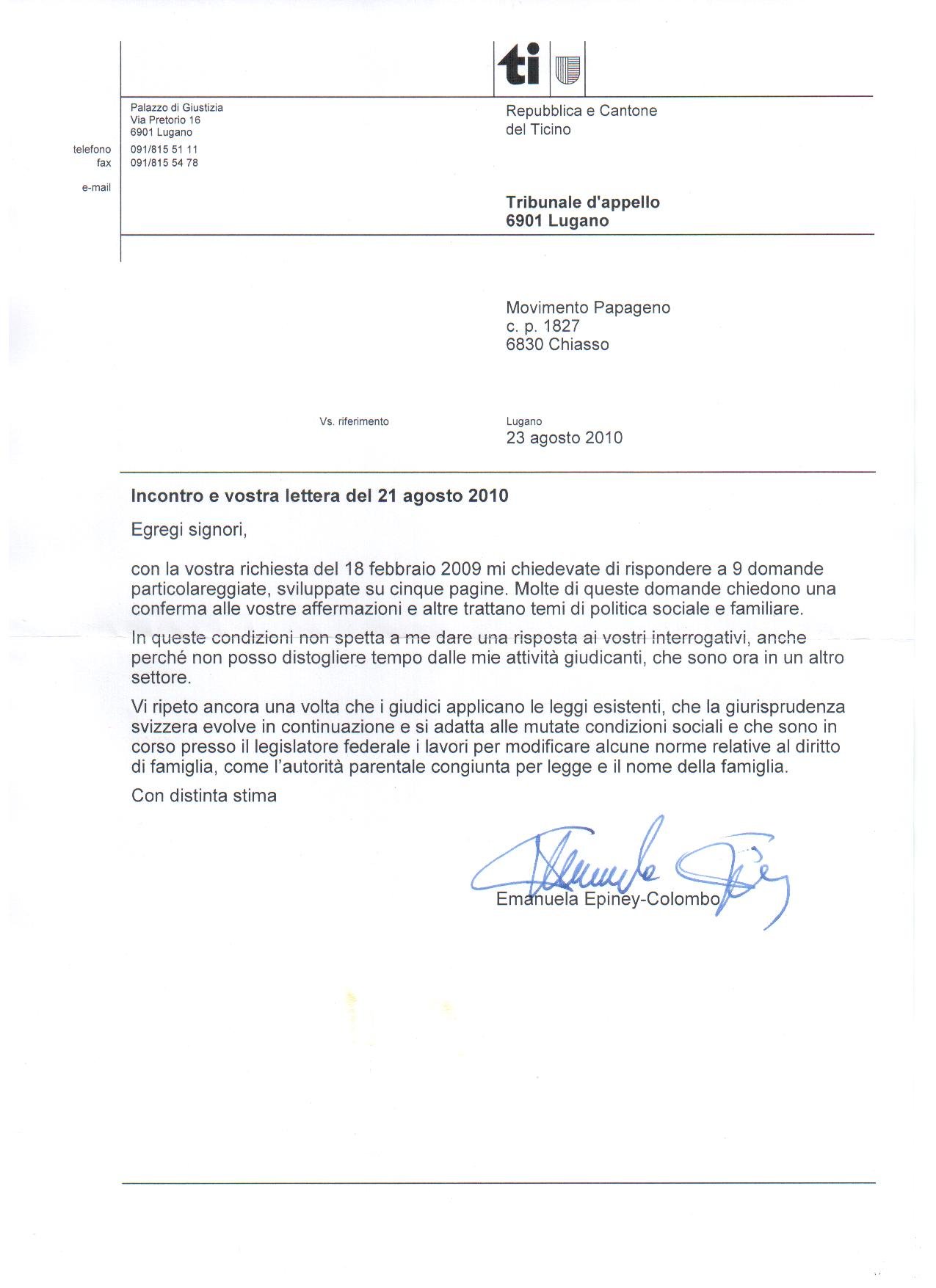 In occasione dell’incontro del 18 febbraio 2009 con la Giudice (allora Presidente del Tribunale d'Appello) Epiney-Colombo, Le abbiamo sottoposto della documentazione e posto per iscritto alcune domande con la preghiera di rispondervi in forma scritta al fine di pubblicare le sue risposte sul nostro sito www.miopapageno.ch. Coscienti dei suoi molteplici e gravosi impegni non ci aspettavamo una risposta in tempi brevi. Tuttavia, trascorsi 18 mesi, ci siamo permessi di riscrivere alla Giudice Epiney-Colombo per ricordarLe che siamo (con i visitatori del nostro sito) tuttora in attesa di poter leggere le sue esaurienti risposte.