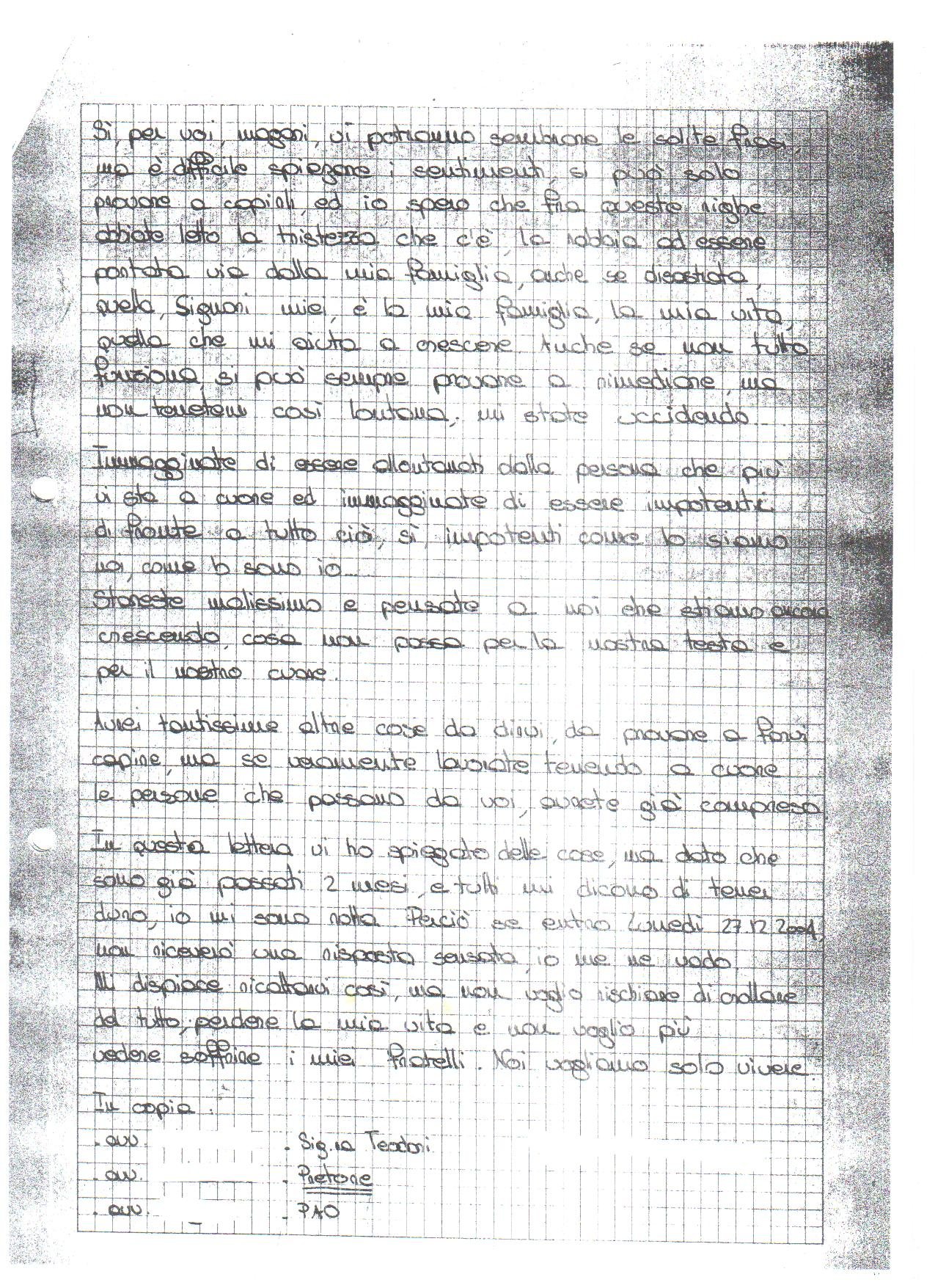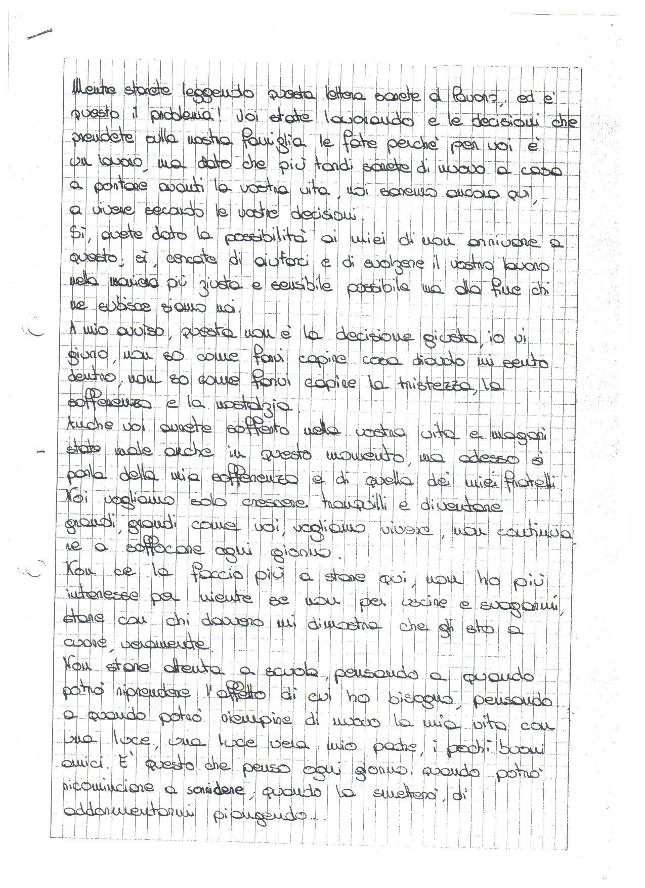 Ecco la lettera (Pagina 1 + Pagina2) che la ragazza adolescente collocata in istituto (PAO) coi suoi fratelli dal Pretore avv. Enrico Pusterla ha scritto e inviato agli operatori sociali del PAO (Capo-équipe psicologo Roberto Saredi), all'assistente sociale Rosetta Teodori-Ambrosini, ai vari avvocati coinvolti e al Pretore medesimo.
