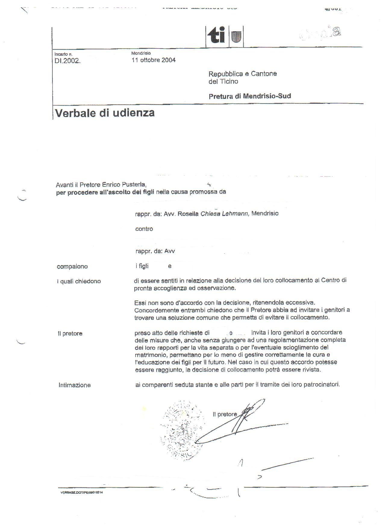 Il Pretore avv Pusterla della Pretura di Mendrisio Sud, prima del collocamento dei tre figli, dopo aver sentito i due figli maggiori adolescenti (tra cui la ragazza che scrive la lettera che segue), ha verbalizzato: "...[il Pretore] invita i genitori a concordare delle misure che, senza giungere ad una regolamentazione completa dei loro rapporti per la vita separata o per l'eventuale scioglimento del matrimonio, permettano per lo meno di gestire correttamente la cura e l'educazione dei figli per il futuro. Nel caso in cui questo accordo potesse essere raggiunto, la decisione di collocamento potrà essere rivista." (ndr: "Il giudice non è vincolato dall'opinione dei periti. Egli pronuncia secondo la propria convinzione. (Art. 253 CPC)". Ma allora, il collocamento era necessario oppure no? Era una misura sproporzionata? Era forse solo un mezzo di pressione sui genitori per obbligarli a trovare un accordo (i genitori erano separati da 2 anni..)?)" (Verbale d'udienza del Pretore) Questo non è avvenuto prima del collocamento, e neppure dopo un mese circa dallo stesso in quanto, sebbene il padre fosse d'accordo a che il figlio minore rimanesse con la madre, l'avv Rosella Chiesa Lehmann (e con essa la madre che, tacendo, sosteneva le affermazioni della sua avv.ta Lehmann) non ha acconsentito a che i due figli maggiori andassero, come loro desiderio, a vivere dal padre, sebbene sostenuto e condiviso dal Pretore e dall'avv del padre e dei minori... Pertanto, grazie alla avv.ta e alla madre, i tre figli sono rimasti ancora internati nell'istituto PAO.