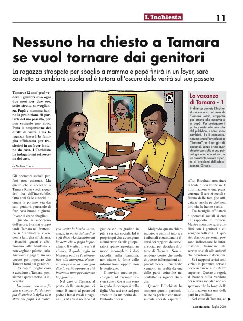 In diverse puntate L'Inchiesta si occupa del caso di "Tamara Rossi", strappata per errore alla mamma e al papà. Per proteggere i protagonisti dalla curiosità del pubblico, i nomi sono cambiati. Se li conoscete, non mostrate l'articolo né a "Tamara" né al suo giro di coetanei, senza prima aver chiesto consiglio a uno psicologo, a un educatore o a un assistente sociale esperto di problemi dell'adolescenza. Grazie.